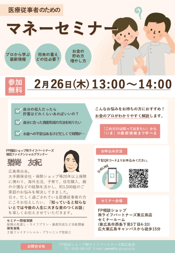 【只今参加者募集中】2月開催【東広島地区】医療従事者の皆様のためのマネーセミナー